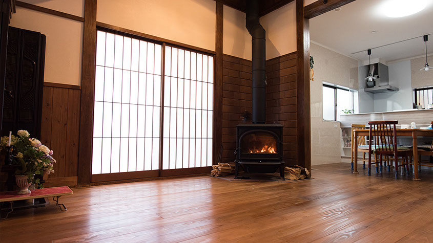 暖炉の薪は リフォームの際に発生した廃材を活用