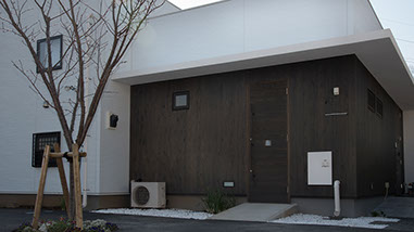 国道から奥まった路地を抜け敷地に入ると 白い外壁と自然味あふれる焼杉の外壁が目をひく I 様邸